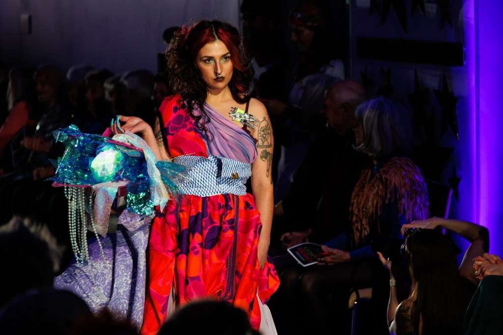 ** Since September 2024, I’ve been working on a 9 piece quasi-autobiographical psyche-surrealist collection entitled, “TULIP QUEEN” and absolutely cannot wait to share it with everyone at this fantastic event, and beyond. The tip of the inspiration and materials iceberg includes: Patrick Shearn’s Psycullescence, manipulated paper, iridescence, nostalgia, pop culture, the beautiful creative human community of Colorado Springs, neon, theatre props, mixed vintage textiles, my 9 incredible models and everything about them, and a six year love affair with Ent Center for the Arts, herself. **